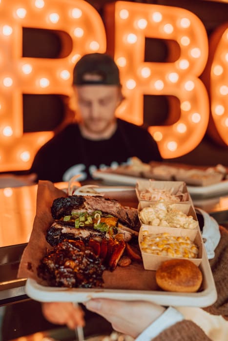 Rökt kött, pulled pork, mac n' cheese, creamed corn.