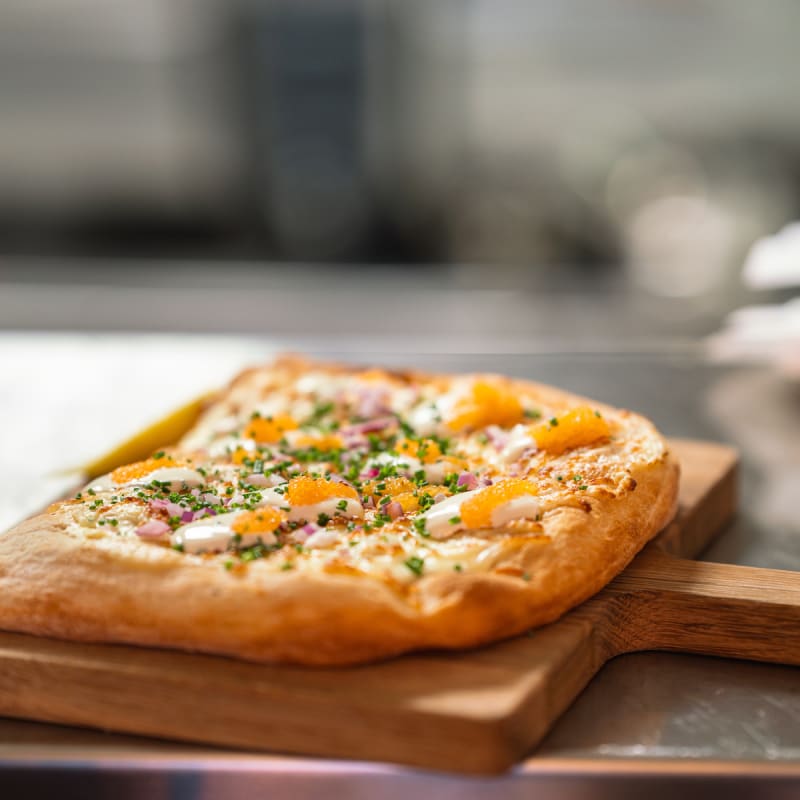 Romana style pizza, pasta, sallad och räkor.