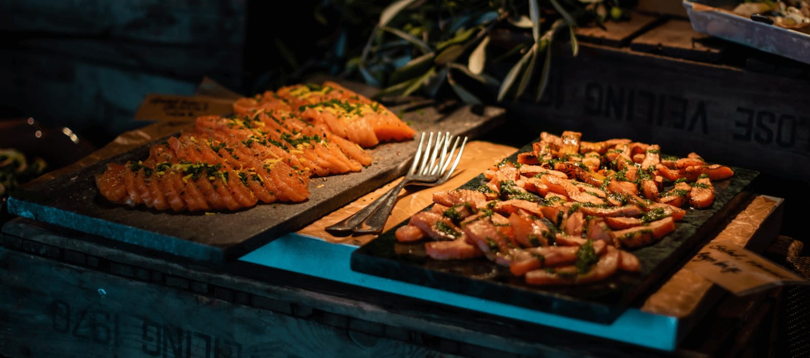 Pizza, kött och fisk på italienskt manér.