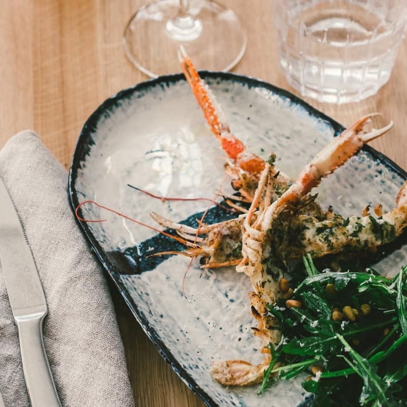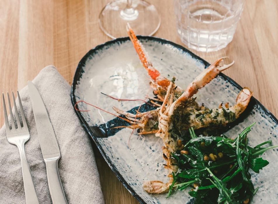 Fisk & skaldjur, gratinerade havskräftor, svensk entrecôte.
