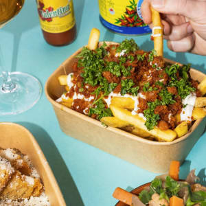 Beer snacks plate, korean dirty fries, roasted chicken bulgur salad.