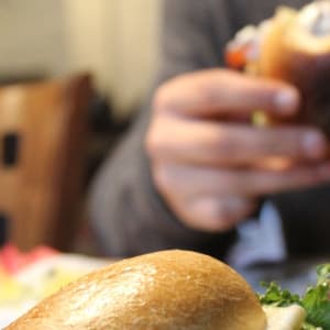 Fisk och skaldjur, grillat, caesarsallad, hamburgertallrikar.
