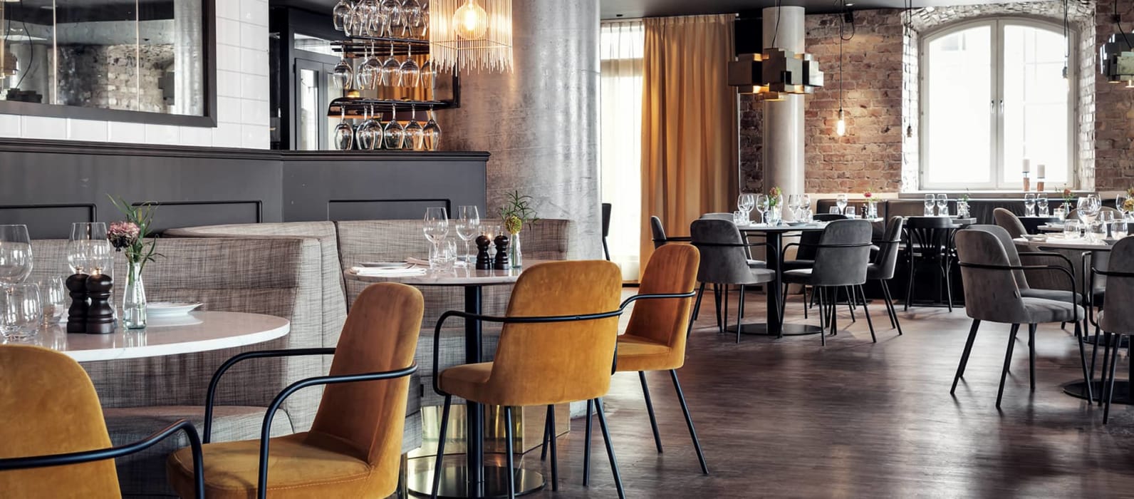 Mysig restaurang i en historisk kvarnbyggnad vid vattnet.
