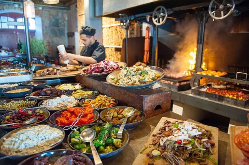 Restaurang i slottsmiljö där maten grillas framför gästerna över öppen eld.
