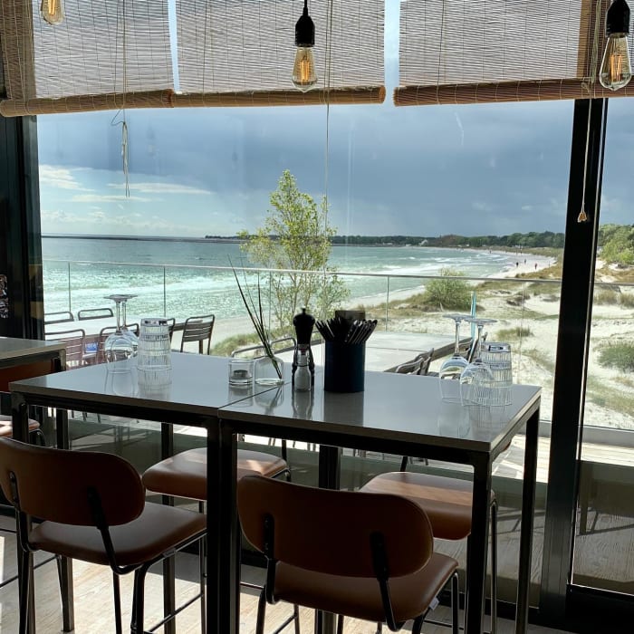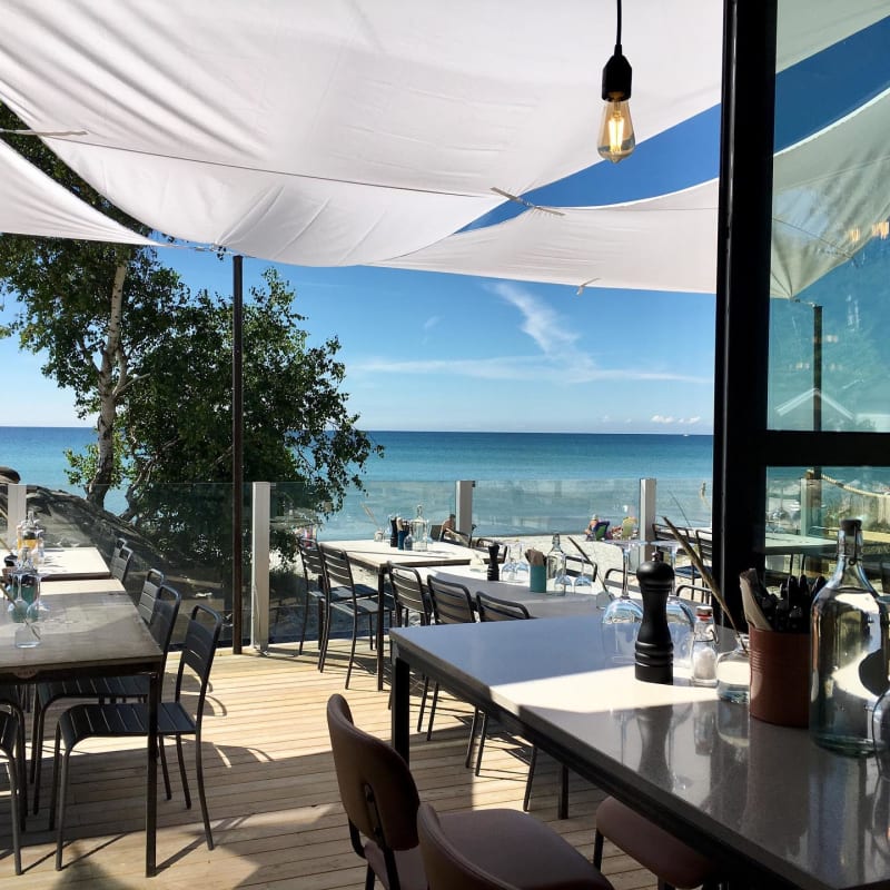 Enbeachclub mitt på stranden i Kämpinge 17 steg från havet. Sitt ute eller inne med en oändlig havsutsikt.