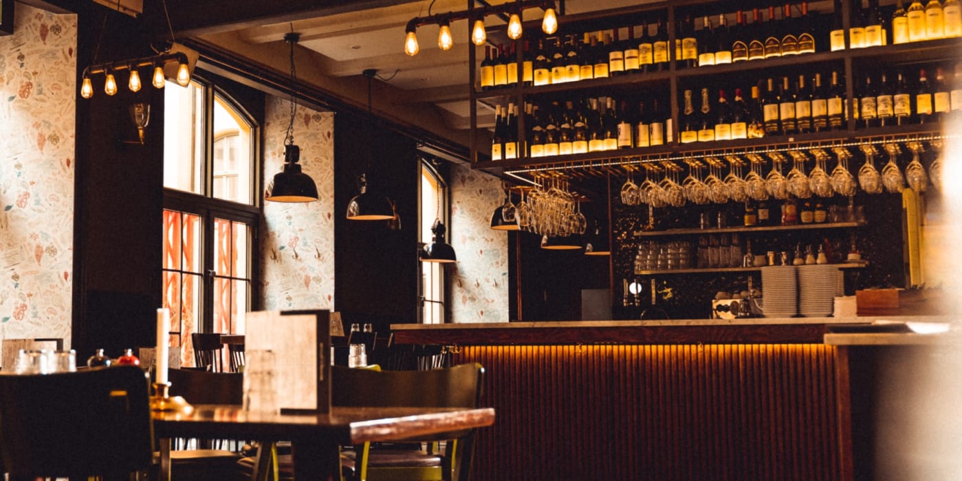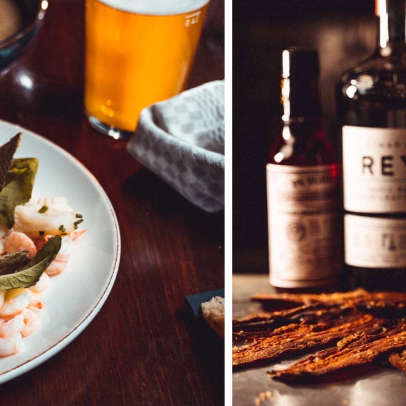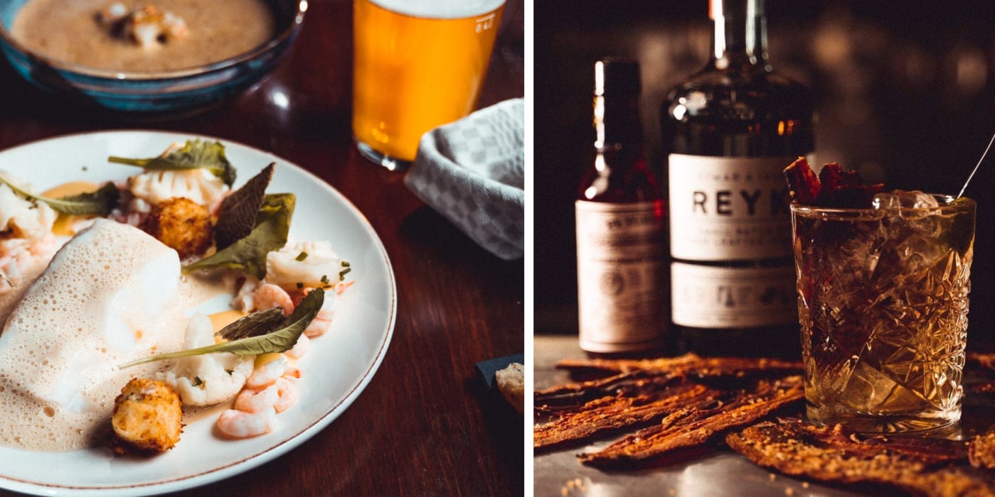 Gedigen öllista, noga utvalda viner och cocktails på egenproducerad sprit från källaren – gin, akvavit, apelsinlikör och mycket annat.