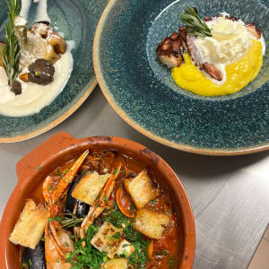 Några exempel från menyn är bläckfisk med saffranspotatis, oxkind med polenta samt pasta och pizzor.