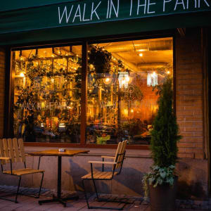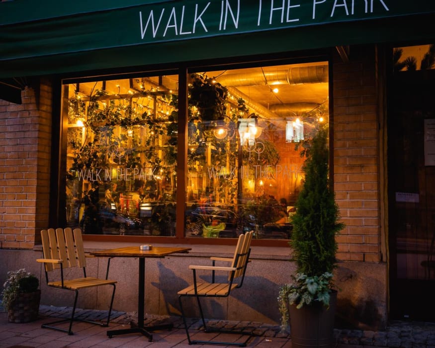 Liten restaurang med park-känsla och avslappnad atmosfär.